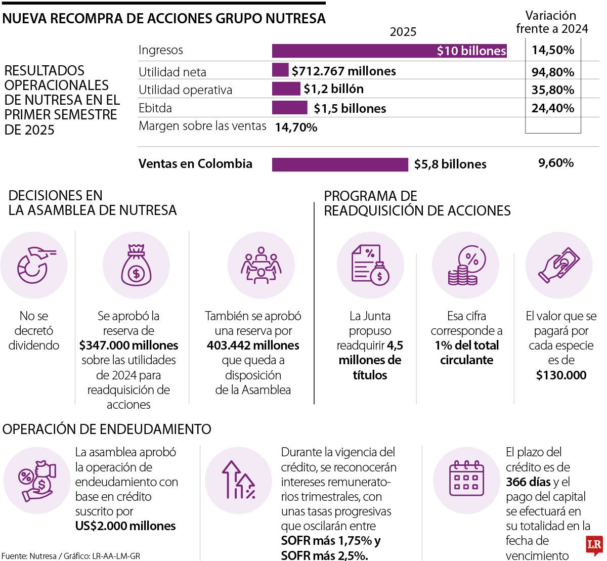 El Grupo Nutresa publicó la oferta de recompra de acciones, y esta vez, la propuesta es de hasta 600.000 títulos, a $130.000 cada uno. Esto va en línea con lo que aseguró Jaime Gilinski, presidente del Grupo, durante la entrega de resultados semestrales, en donde dijo que no van a dar dividendos este año para poder realizar la recompra de acciones que aprobó la Asamblea a inicios de año.