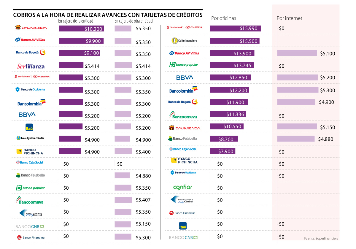De acuerdo con los datos arrojados por el simulador de la Superfinanciera, el costo por realizar avances con tarjetas de crédito en las oficinas bancarias va desde $0 hasta $15.990. Las entidades con los cobros más altos son Scotiabank Colpatria ($15.990), Coltefinanciera ($15.500), Av Villas ($13.900), Banco Popular ($13.745) y Bbva Colombia ($12.850). Mientras que Banco de Occidente, Coopcentral, Finandina e Itaú no realizan ningún cobro por este servicio en las oficinas. Esto contrasta con que al realizar avances por medio del canal digital, la mayoría de entidades no cobran.