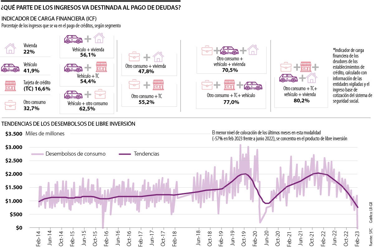Según el informe de la Superfinanciera, quienes pagan una tarjeta de crédito más un crédito vehicular estarían destinando 54,4% de sus ingresos para el pago de dichas deudas, cifra que, aunque parece alta, es la más baja si se compara con otros tipos de crédito.