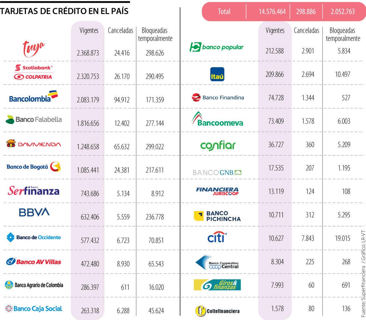 Lo que manifestó el ejecutivo se evidencia en las cifras de la Superfinanciera. Según el ente de control, en enero de 2020 había 16 millones de tarjetas de crédito en el país y 1,9 millones bloqueadas; para el primer mes de este año hubo una reducción de 1,5 millones en los plásticos que circulan a nivel nacional y un aumento de 99.636 en estos productos financieros en estado de congelamiento.