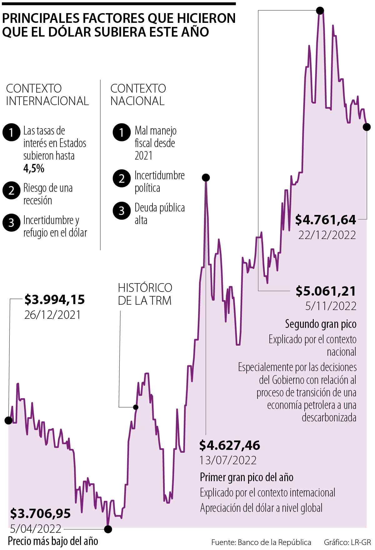 Este precio alto de principios de año se debe a “el mal manejo fiscal que tuvo la economía en 2021 y en 2022, el Gobierno de Iván Duque tuvo dos intentos de reformar las graves tendencias de las finanzas públicas por el covid, pero los dos intentos fallaron”, aseguró Andrés Langebaek, director Estudios Económicos Grupo Bolívar.