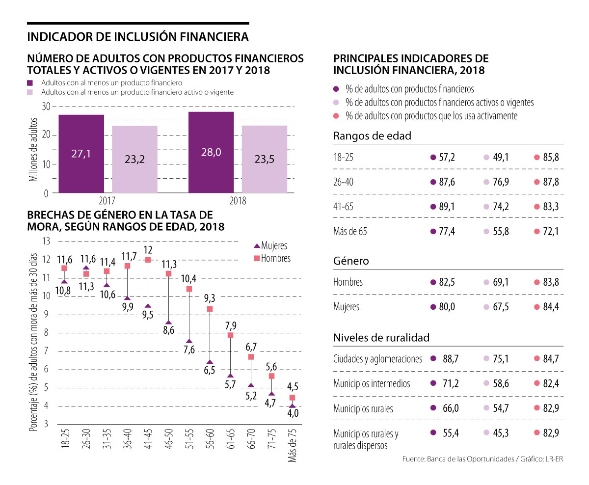 Otro hallazgo fue que el indicador de inclusión financiera aumentó a 81,4% al cierre del año pasado, 1,3 puntos porcentuales más que el indicador de 2017, cuando se ubicó en 80,1%. Esto quiere decir que, en el último año, 28 millones de los 34 millones de adultos que hay en el país tenían acceso a por lo menos un producto financiero.