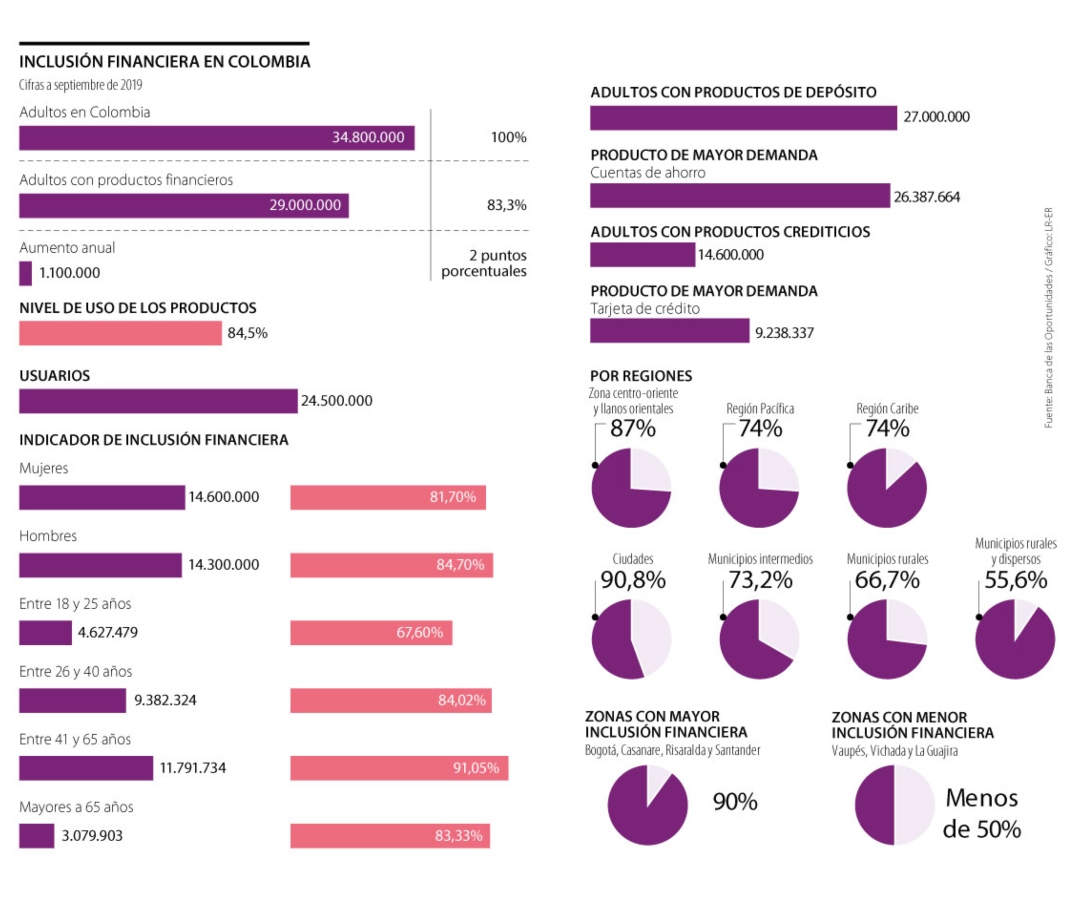 A septiembre de 2019, de los cerca de 35 millones de adultos que hay en el país, 29 millones cuentan con algún producto financiero, lo que significa que 83,3% de la población apta para adquirir estos servicios tiene uno en su poder.