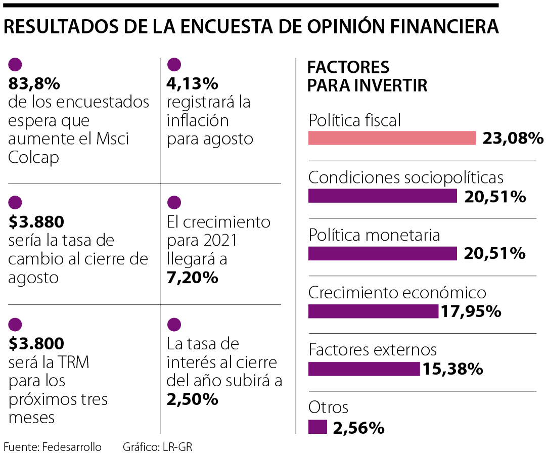 Según al más reciente Encuesta de Opinión Financiera (EOF), realizada por el centro de pensamiento Fedesarrollo, 83,8% de los analistas esperan que el índice bursátil de la Bolsa de Valores de Colombia, Msci Colcap, se valorice en los próximos tres meses. 16,2% espera que se desvalorice y ningún experto prevé que se mantenga inalterado en los próximos tres meses.