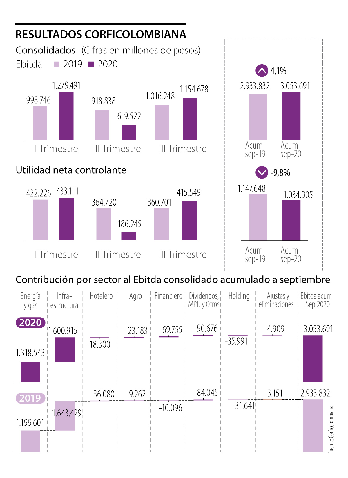 A pesar de la crisis que genera el covid-19 en lo corrido del año, Corficolombiana registró ganancias por $415.549 millones en el tercer trimestre de 2020, lo que le significó un crecimiento de 15,2% respecto al mismo periodo del año anterior. El sector de infraestructura fue el que más aportó al comportamiento trimestral, a pesar de que la pandemia aún pesa en las cifras anuales de la compañía, pues de enero a septiembre las utilidades reportadas fueron de $1,03 billones, 9,8% menos cuando se mira el mismo periodo de 2019.