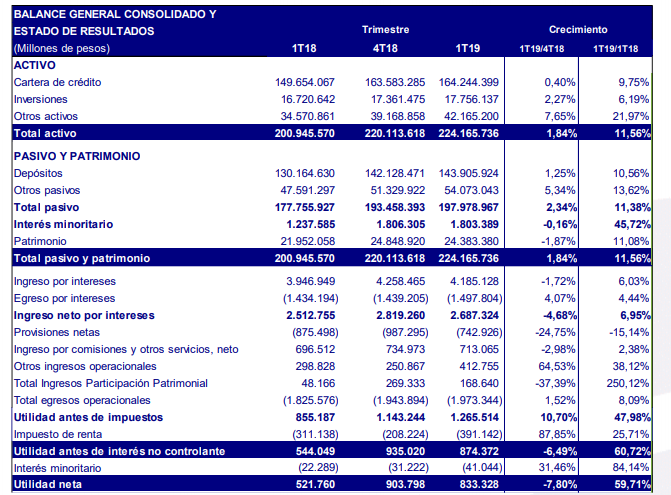 En cuanto a los activos registrados por el banco, la cartera de crédito en el primer trimestre de 2019 llegó a $164.244.399 millones, lo que evidenció un crecimiento de 9,75% en comparación con el primer trimestre de 2019.