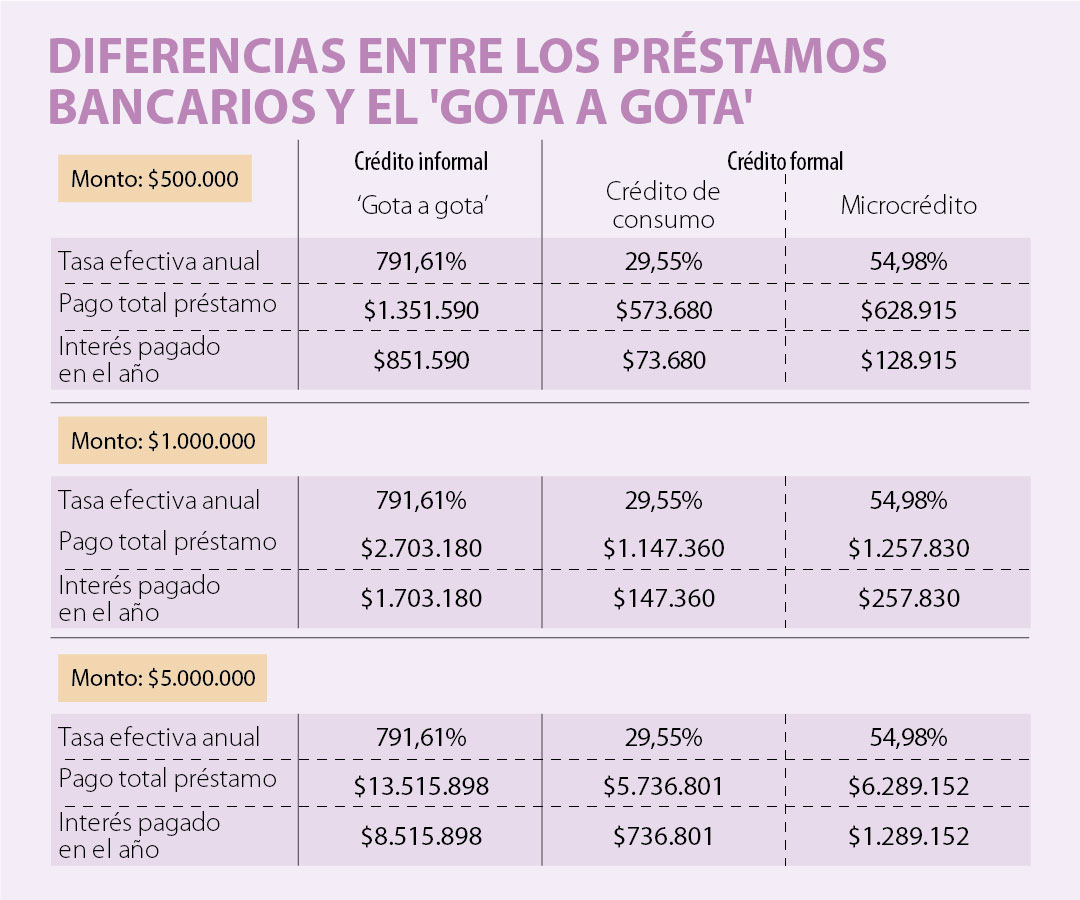 En el ejercicio se encontró que por un préstamo de $500.000 a 12 meses, al final del plazo quien pidió el crédito de consumo paga en total $573.680; el que solicitó el microcrédito, $628.915, mientras que quien accedió al ‘gota a gota’ entrega $1,35 millones. Para el préstamo de $1 millón, al final del año, el pago total de un interés de consumo es $1,15 millones, en el de microcrédito es $1,26 millones, y en ‘gota a gota’ es $2,7 millones.