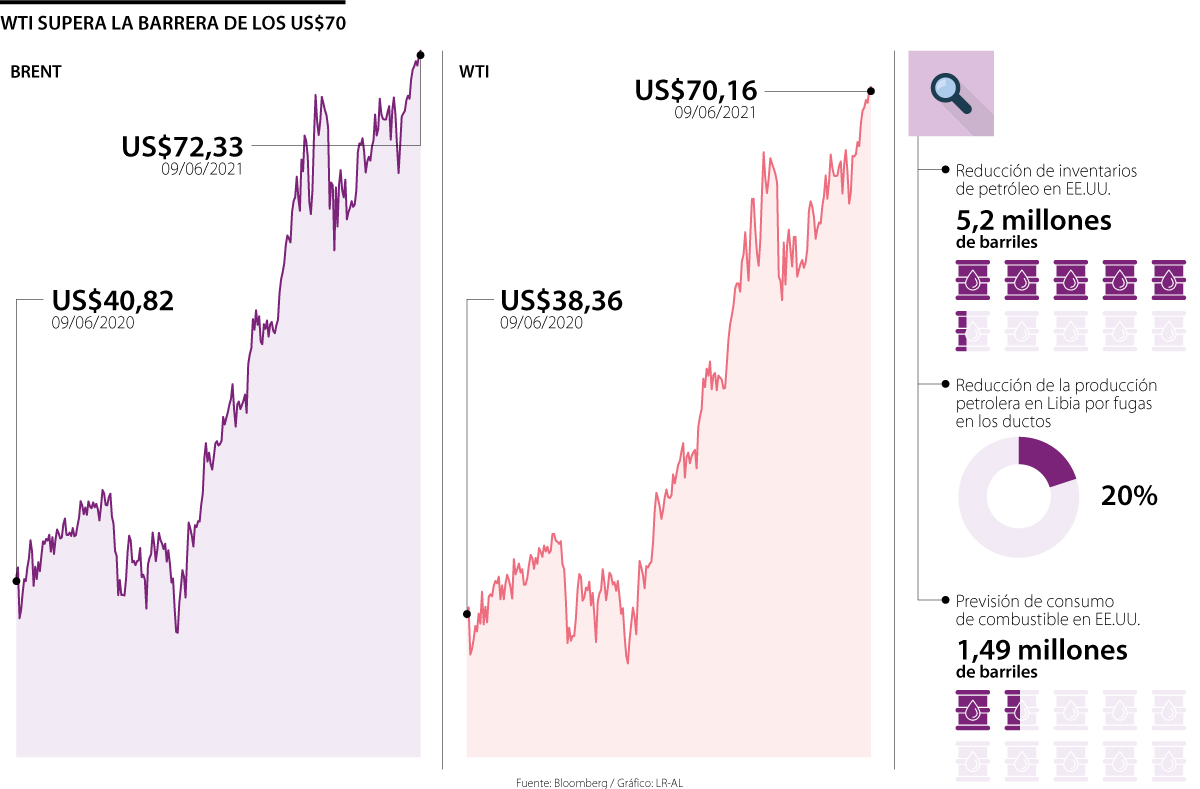 “Para los mercados energéticos, se estima que la demanda global de petróleo sería de 100 millones de barriles por día durante el tercer trimestre del año. Durante los próximos días, las miradas estarán puestas en ese techo psicológico de US$70 que ha sobrepasado la referencia Brent, ya que su camino al alza puede ser más próspero aún. Mientras que para la referencia WTI, la tendencia alcista no sería tan firme y marcaría un promedio cercano a los US$68”, manifestó José Pedro Giraz, director para América Latina de Skilling.