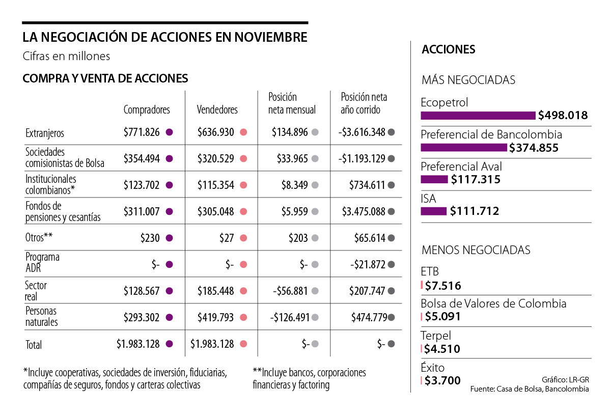 Las sociedades comisionistas de bolsa, que a lo largo del año se habían mantenido como vendedores netos, fueron los segundos compradores netos en noviembre, con $33.965 millones. Ecopetrol ($18.679 millones) y Grupo Sura ($7.520 millones) fueron las acciones que compraron más.