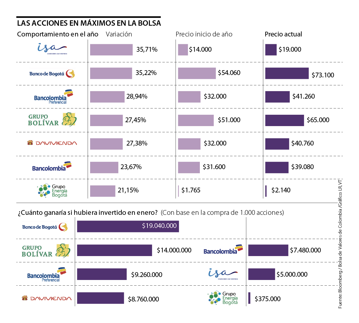 La mayoría de acciones a nivel local ven ganancias, e incluso siete lograron llegar a sus máximos históricos, con alzas de más de 20%. Estas son: ISA (35,71%), Banco de Bogotá (35,22%), Preferencial Bancolombia (28,94%), Grupo Bolívar (27,45%), Preferencial Davivienda (27,38%), Bancolombia (23,67%) y Grupo Energía Bogotá (21,15%).