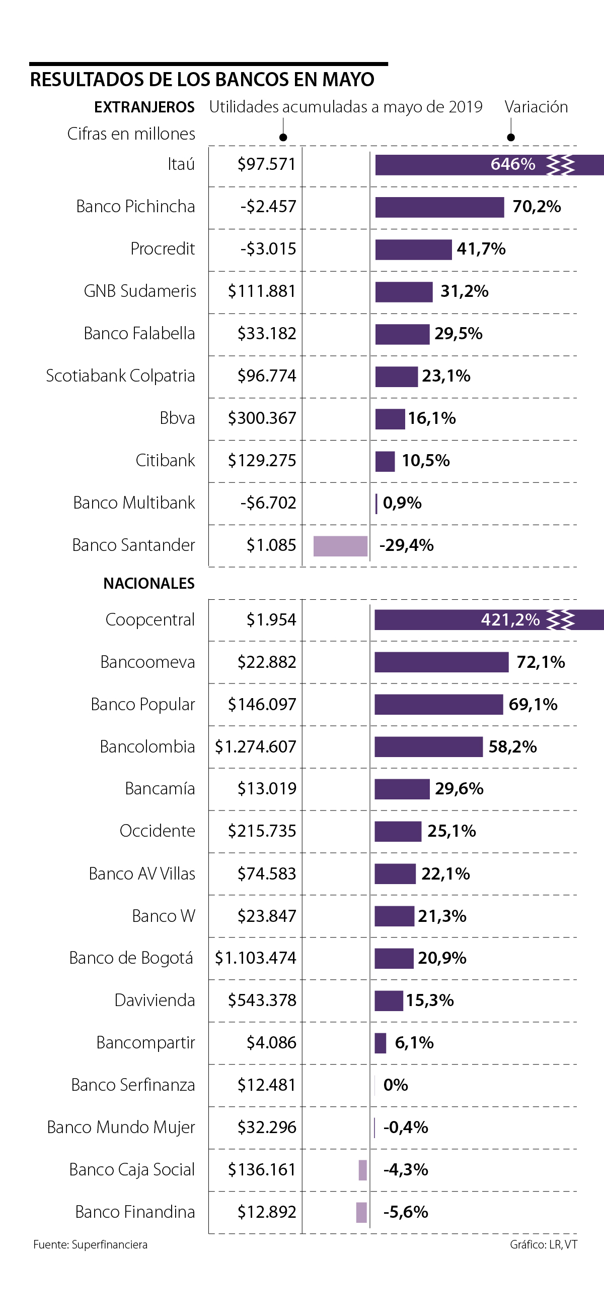 En los primeros cinco meses del año, en general, el sector bancario registró resultados positivos, pues las ganancias aumentaron $4,38 billones. El banco extranjero que logró un mayor crecimiento en sus utilidades fue Itaú Colombia, que pasó de -$17.869 millones en mayo de 2018 a $97.571 millones. La variación anual fue de 646%.