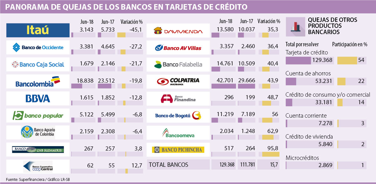 Ahora, se debe tener en cuenta que uno de los objetivos de las entidades bancarias es lograr que sus clientes estén completamente a gusto con sus productos, punto que se ha logrado si se compara las cifras del segundo trimestre de este año frente a las de 2017 en los bancos Itaú, Banco de Occidente, Banco Caja Social y Bancolombia, que son los que más han disminuido en quejas frente a los plásticos, al tener variaciones de -45,18%; -27,21%; -21,76%, y -19,88%, respectivamente.