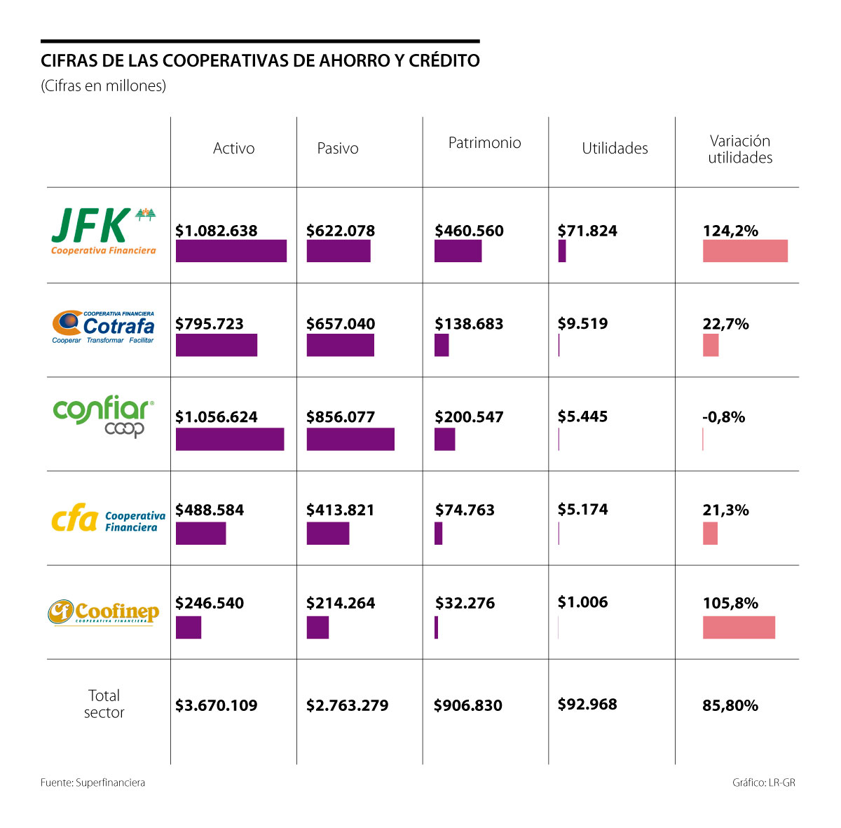 La revisar las cifras de las líderes, John F. Kennedy también es la más grande en activos ($1,08 billones) y en patrimonio ($460.560 millones). Además, es la que tiene las utilidades que más crecen con una variación de 124,2%. Esta cooperativa sin ánimo de lucro nació en Antioquia hace 55 años y actualmente ofrece créditos y servicios de depósito y ahorro.