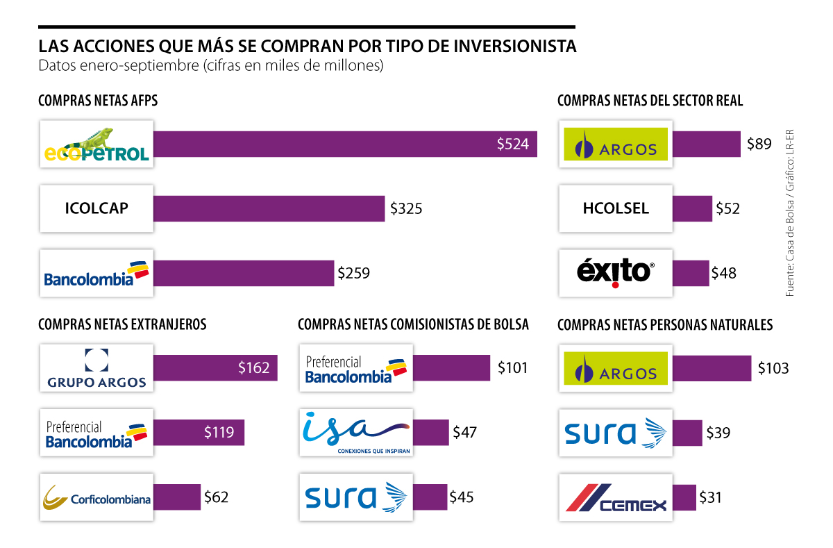 Entre las personas naturales, las acciones preferidas para compra entre enero y septiembre fueron la de Cementos Argos ($103.000 millones), que también estuvo entre las más compradas por el sector real ($89.000 millones); la de Grupo Sura ($39.000 millones) y la de Cemex Latam Holdings ($31.000 millones).