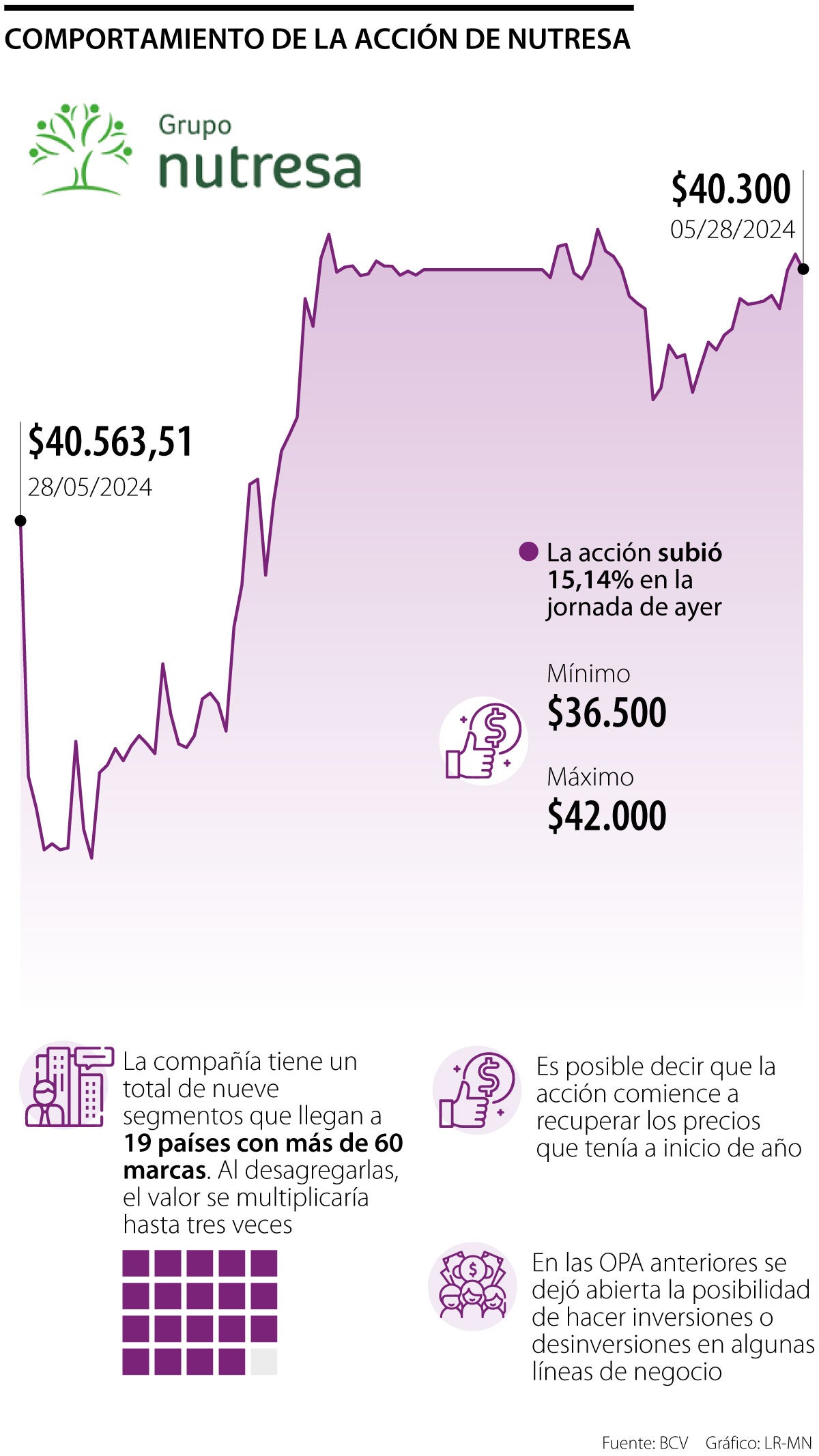 Luego de que Grupo Nutresa comunicara que recibió propuestas de compañías internacionales interesadas en comprar segmentos significativos del holding, sus acciones han subido en la Bolsa de Valores de Colombia, BVC, alcanzando una variación de 15,14%, a un precio de $40.300.