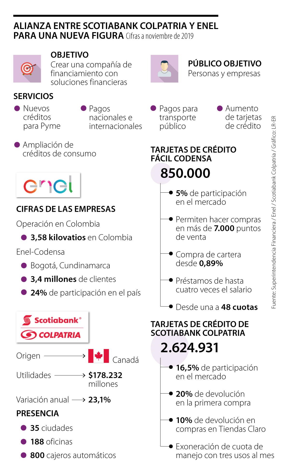 Vale recordar que, según las últimas cifras de la Superintendencia Financiera, a noviembre de 2019, Scotiabank Colpatria contaba con una participación en el mercado de tarjetas de crédito de 16,54%, con 2,6 millones de unidades activas. Por su parte, el Crédito Fácil Codensa registró un promedio de 850.000 plásticos y una participación de mercado de 5%.