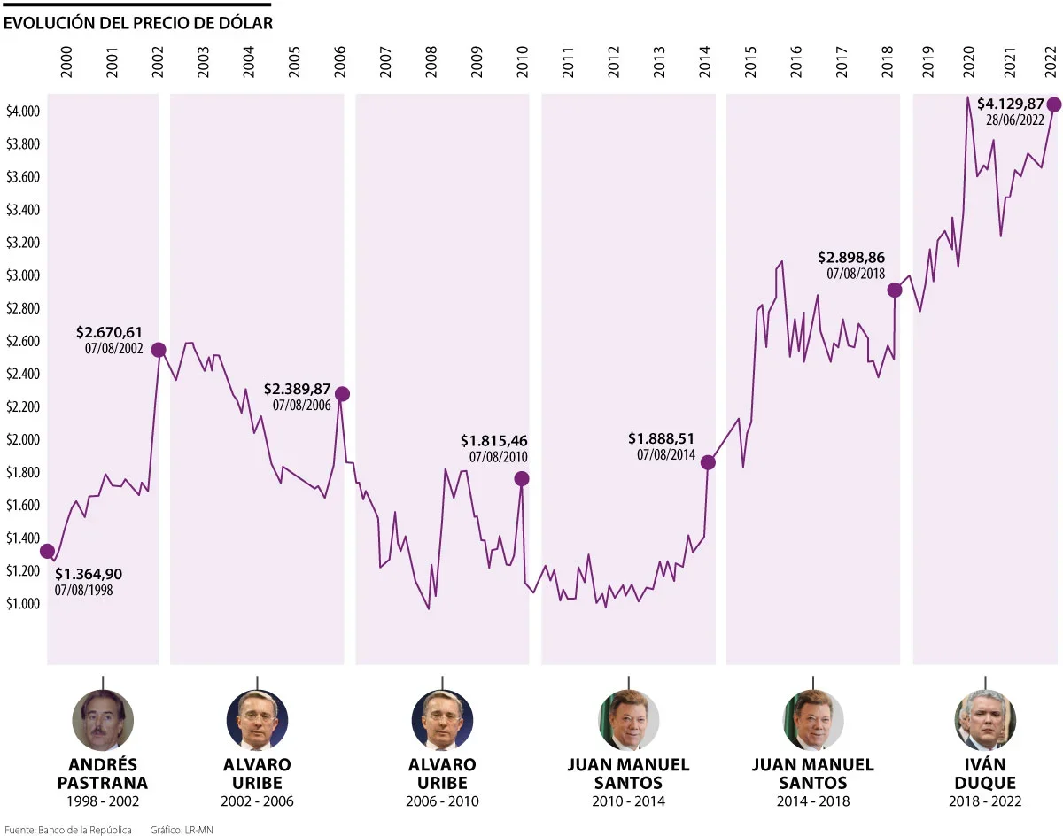La República ha venido analizando la relación entre cómo recibe un mandatario el dólar, y cuánto se devalúa el peso colombiano a lo largo de los periodos presidenciales.
