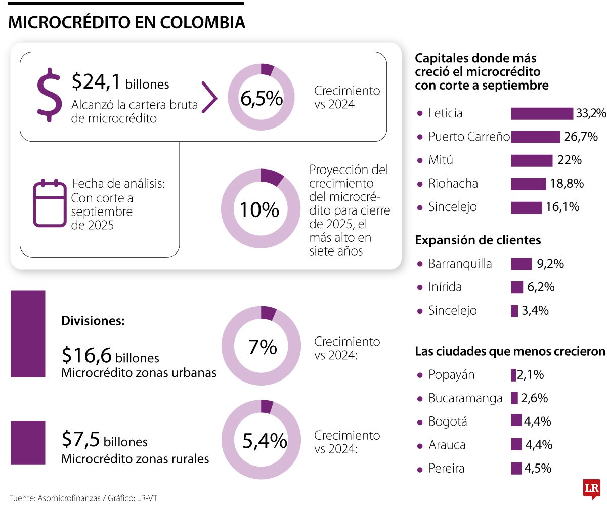 La Asociación Colombiana de Instituciones Microfinancieras, Asomicrofinanzas, informó que la cartera bruta de microcrédito alcanzó $24,1 billones hasta septiembre de 2025, lo que representó un crecimiento real de 6,5% frente al mismo periodo del año anterior.