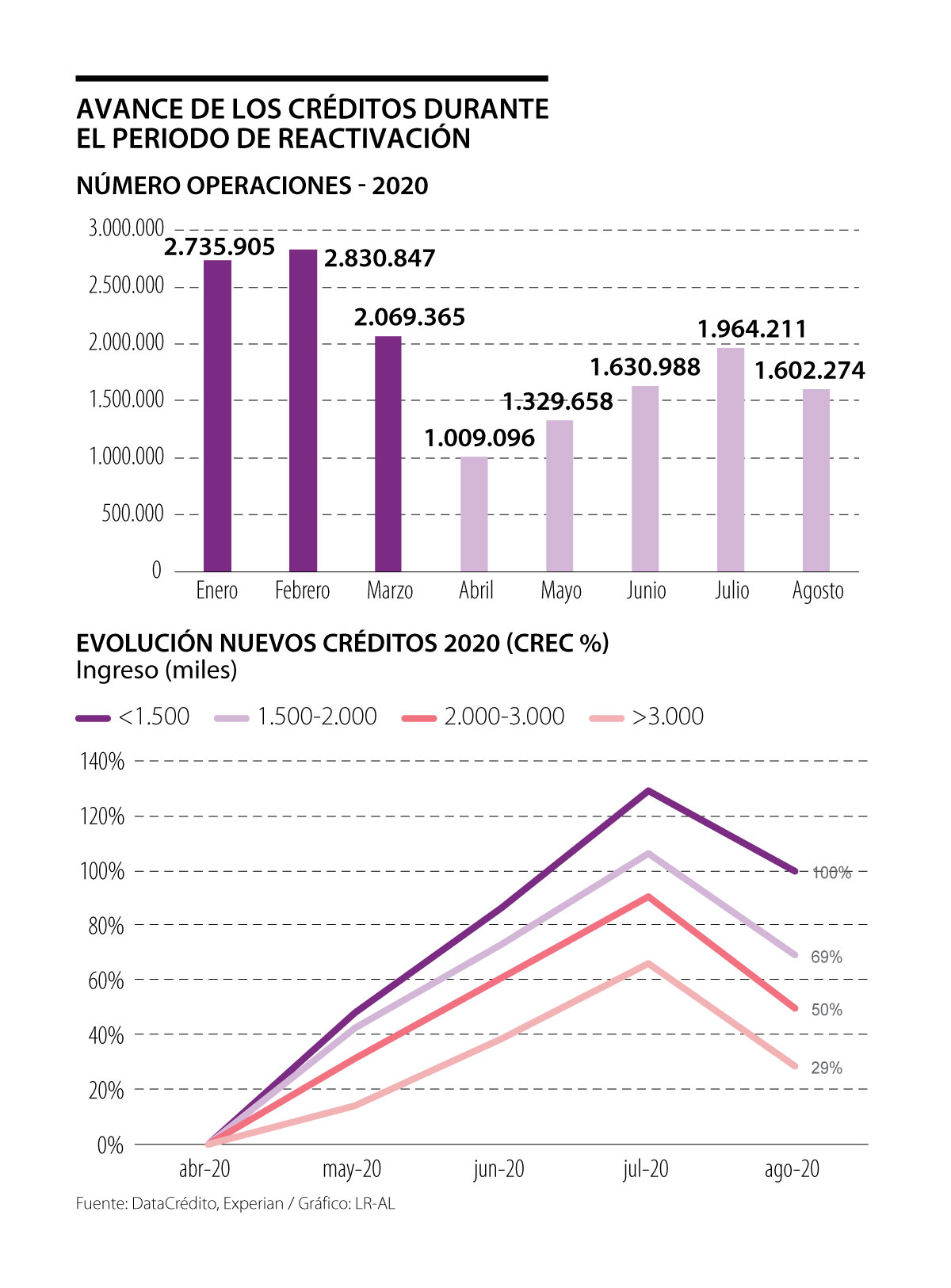 Lo señalado por el docente de la Universidad de El Bosque se refleja en que al revisar las operaciones de créditos por estratos muestra que “el estrato uno fue el de mejor desempeño, creciendo 77% hasta agosto, seguido de los estratos cinco y seis con alrededor de 65%, los estratos dos y tres con crecimientos cercanos a 57% y en menor medida el estrato cuatro con un alza de 40%”, destacó Datacrédito Experian en el documento.