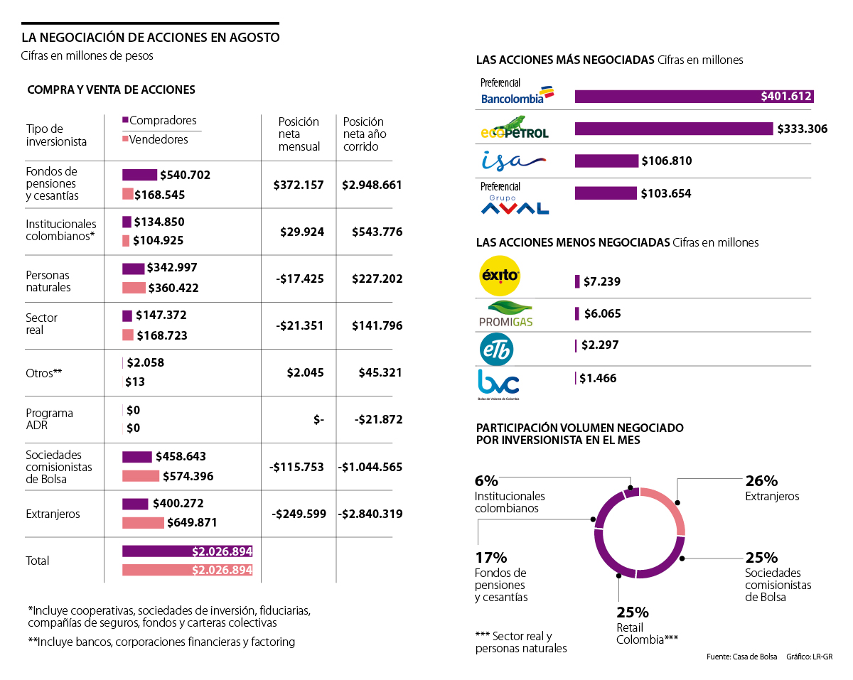En cuanto a las acciones más negociadas durante agosto, el primer lugar lo ocupó la preferencial de Bancolombia, con $401.612 millones; seguida de Ecopetrol, con $333.306 millones, e ISA, con 106.810 millones.