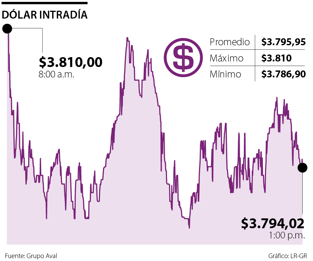 El dólar cerró con un precio promedio de negociación de $3.79,95 en la última jornada, lo que representó una caída de $30,9 frente a la Tasa Representativa del Mercado (TRM), que se ubicó en $3.826,85.