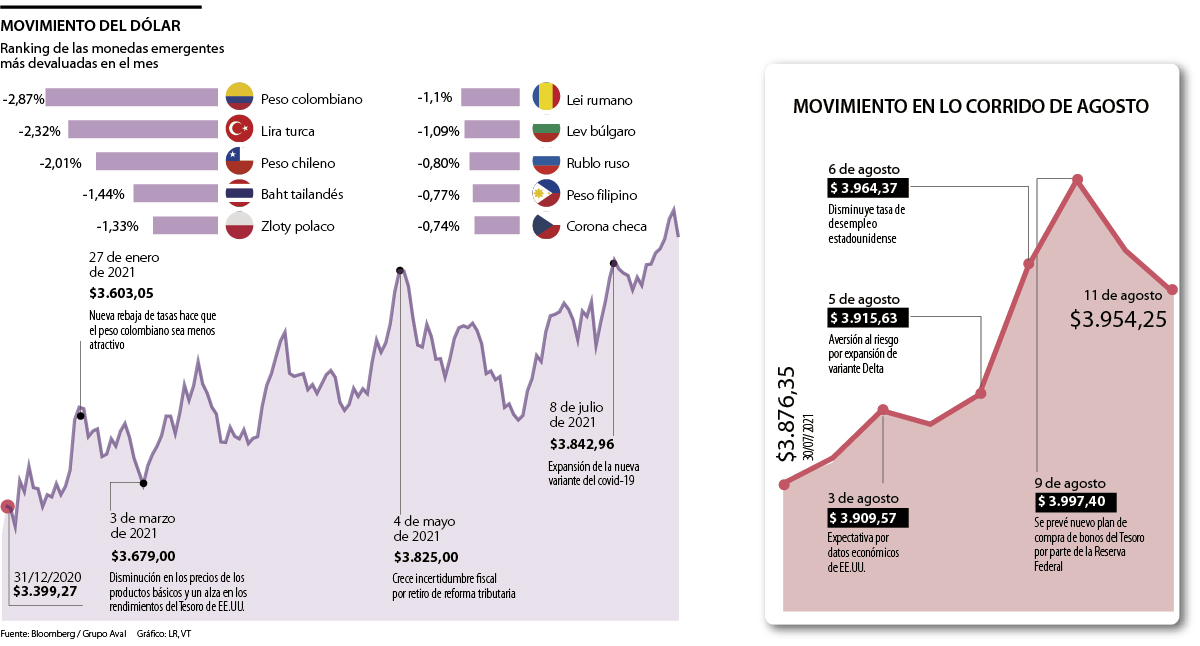 El peso ha perdido 2,87% en lo que va de agosto y se posiciona como la primera moneda emergente más devaluada del mes, según datos recopilados por Bloomberg. Le siguen la lira turca, con -2,32%; y el peso chileno, con -2,01%. Sin embargo, en lo que va del año se ha devaluado 13,29% y se posiciona como la segunda divisa que más ha perdido valor. Alejandro Useche, profesor de la Universidad del Rosario, dijo que, “aunque tenemos una moneda volátil, sigue siendo fuerte, pues no ha sufrido grandes cambios en años”.