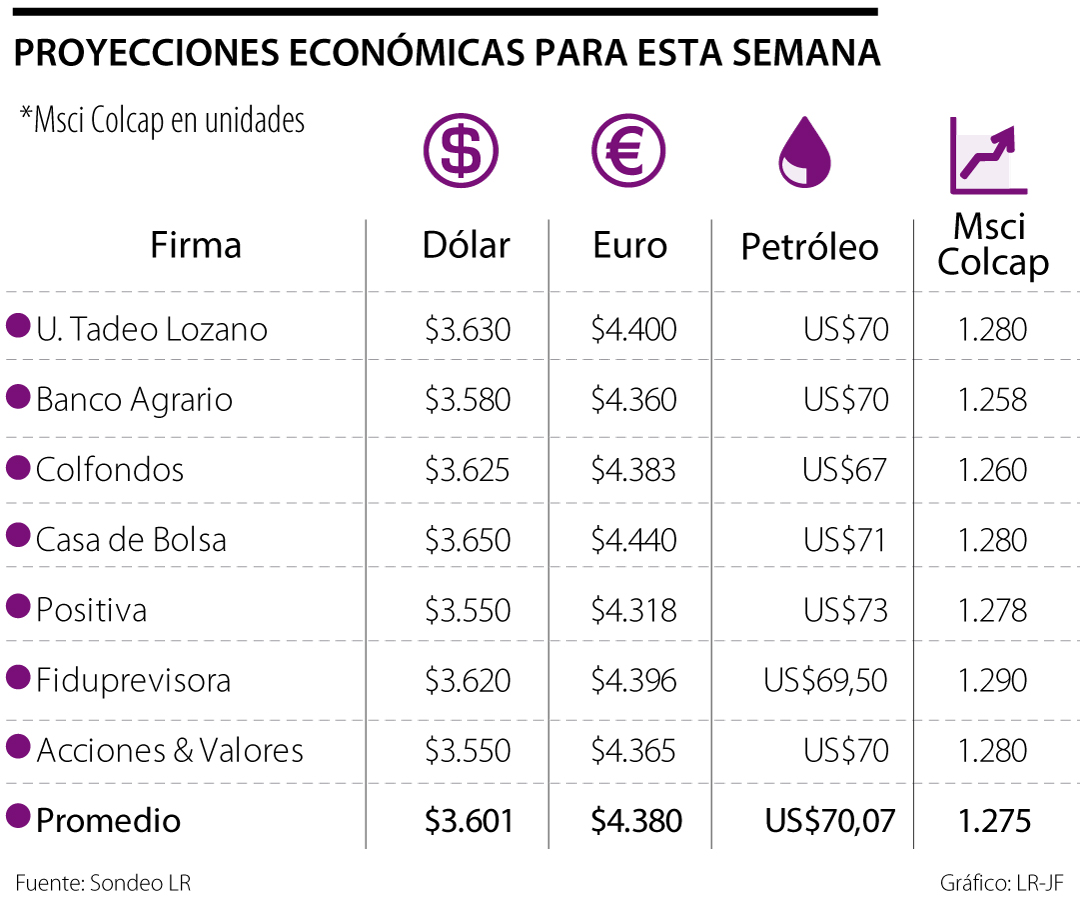 El barril del petróleo estadounidense WTI llegará a US$70,07, mientras que el euro tocará $4.380 y el Msci Colcap registrará 1.275 puntos