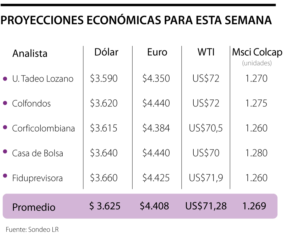 El barril de petróleo WTI se cotizará a US$71,28, mientras que el euro llegará a $4.408 y el índice Msci Colcap tocará 1.269 puntos