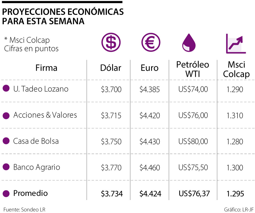 El euro llegará a $4.424 en promedio, mientras que el barril de petróleo WTI se cotizará a US$76,37 y el Msci Colcap 1.295 puntos