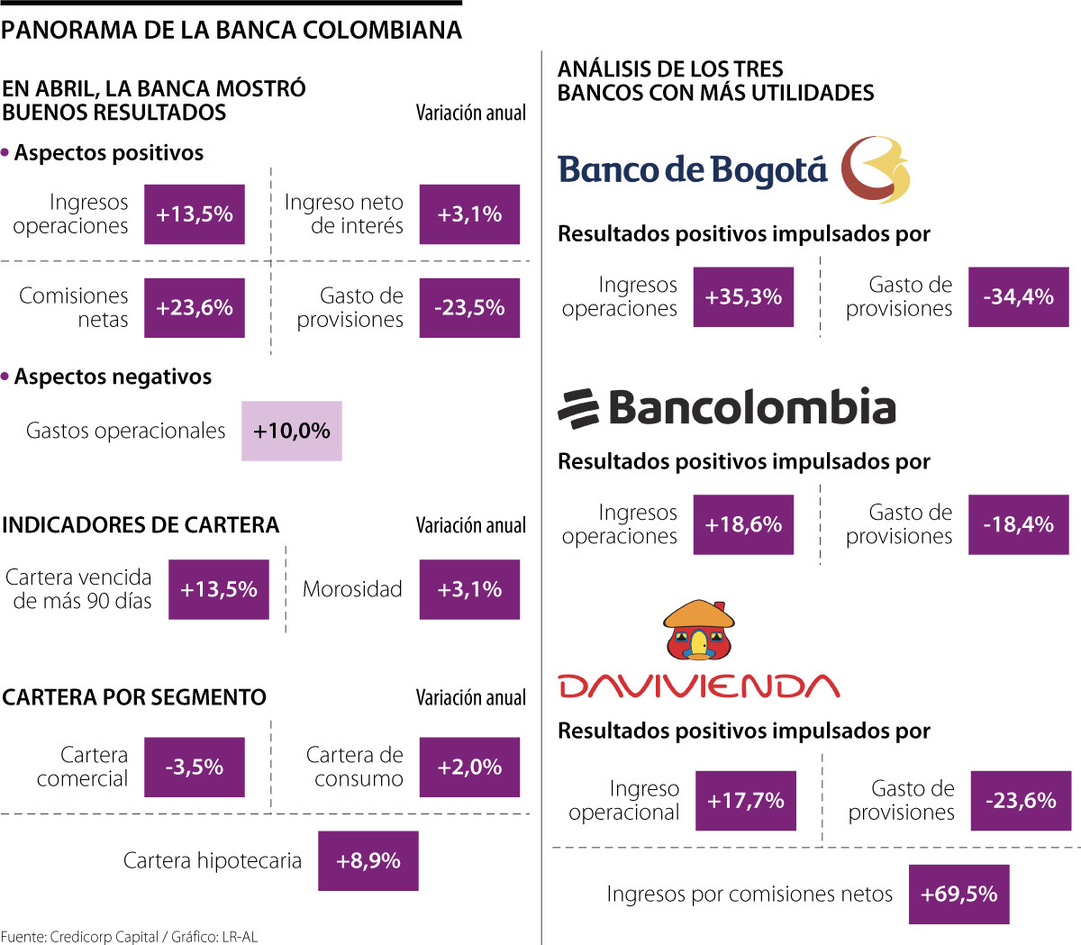 La firma también realizó un análisis de los tres bancos con más utilidades en ese mes: Banco de Bogotá, con ganancias por $1 billón; Bancolombia, con $561.490 millones; y Davivienda, con $320.742 millones. La firma destacó que este buen desempeño estuvo jalonado por mayores ingresos operacionales y menos gasto en provisiones.