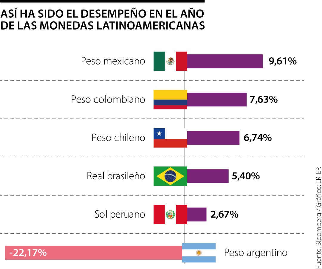 Según la cesta de canastas que mide Bloomberg, el peso argentino, en medio de la fuerte crisis de divisas de ese país, es la única latinoamericana que en el año ha perdido terreno frente al dólar. Al peso colombiano es al segundo que mejor le va con un alza de 7,63%.