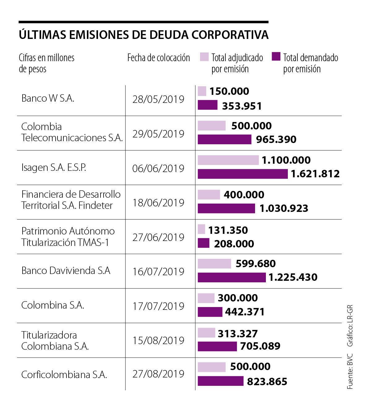 El último movimiento de Corficolombiana, tras 20 años fuera de este mercado, acrecentó las cifras de las ofertas públicas de bonos de 2019, las cuales, antes de la colocación de $500.000 millones de la firma de Grupo Aval, llegaba a $7,8 billones, con una sobredemanda de $15 billones, lo que demuestra el apetito de los inversionistas por este tipo de deuda corporativa.
