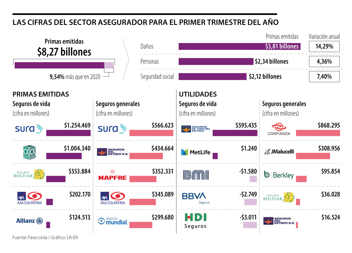 Respecto a los seguros generales, las aseguradoras registraron primas por $4,6 billones, 11,21% más que en 2020.