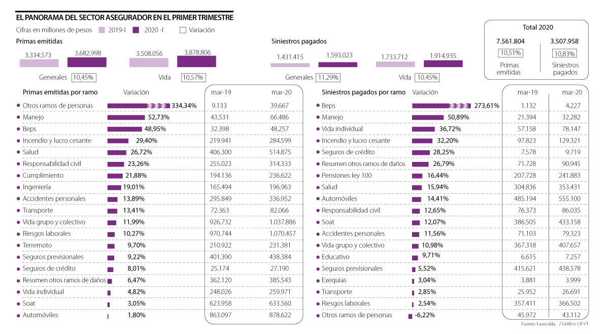 Durante el primer trimestre de este año, el sector asegurador emitió primas por $7,56 billones, lo que significó un aumento de 10,51% frente a las primas emitidas por $6,84 billones en el mismo periodo de 2019.