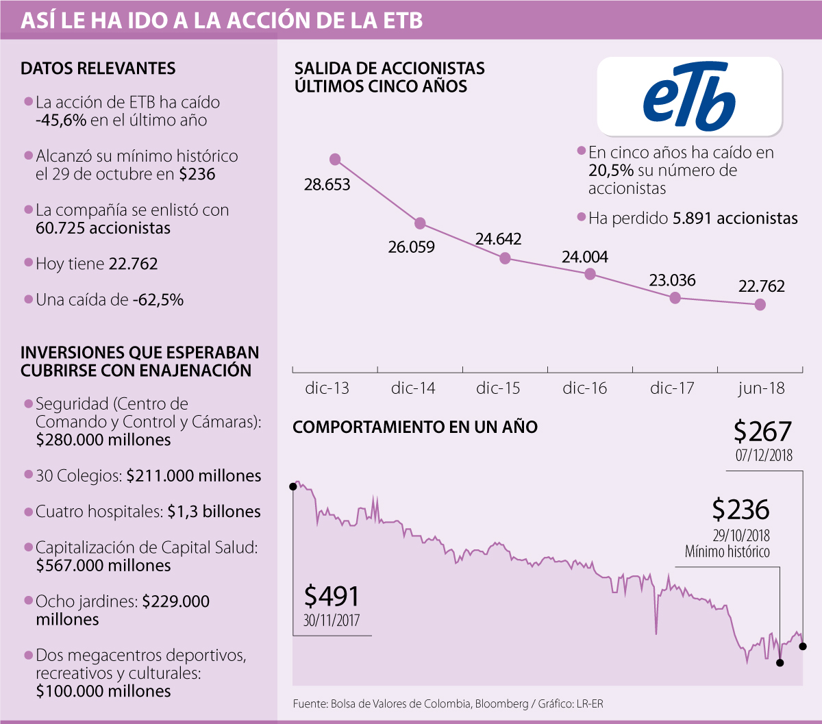 Además, pese a que diferentes sectores han celebrado la decisión del Tribunal, este mismo respaldo no se ve representado en inversión pues el número de accionistas de la ETB ha caído 20,5% en los últimos cinco años hasta 22.762. Esta cifra que a su vez representa 62,5% menos que cuando se enlistó en la Bolsa de Valores de Colombia y logró 60.725 inversores.