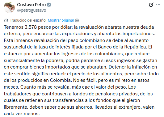 El presidente de la República, Gustavo Petro, se refirió al precio del dólar, el cual tocó precios de $3.578 en la jornada de hoy. El mandatario aseguró que la revaluación abarata la deuda externa de Colombia, así como las importaciones, pero encarece las exportaciones.