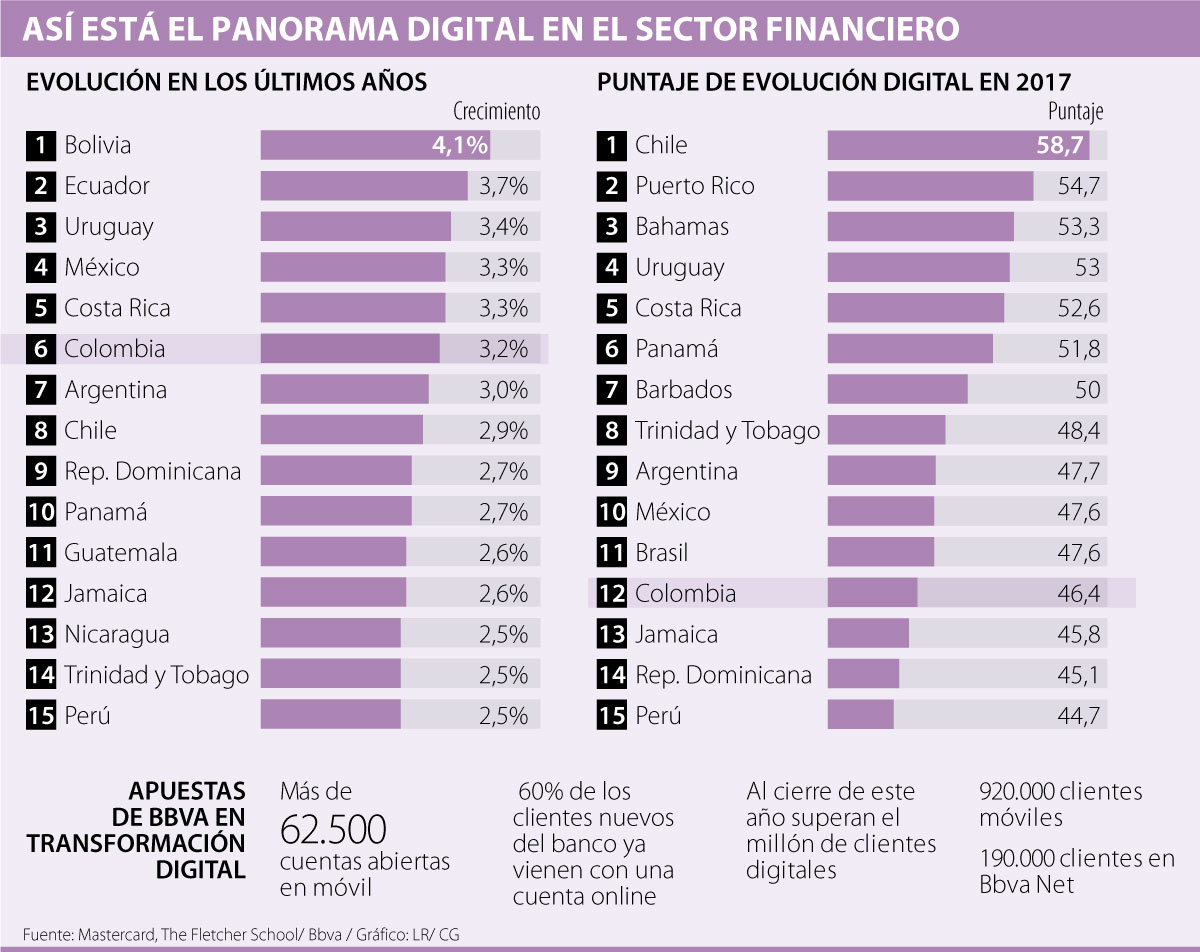 No obstante, para cambiar esa posición respecto a otros países, los bancos colombianos están potenciando su trabajo en el ámbito digital. Bbva, que anualmente destina US$30 millones para la transformación digital, es uno de los ejemplos. Esta inversión permitió que recientemente recibiera el título del primer banco en transacciones financieras hechas por el celular, ya que de los 75 millones de clientes en el mundo, ya tienen 25,1 millones de clientes digitales y 20,7 millones de móviles, permitiendo que 30% de las ventas del grupo se haga digitalmente.