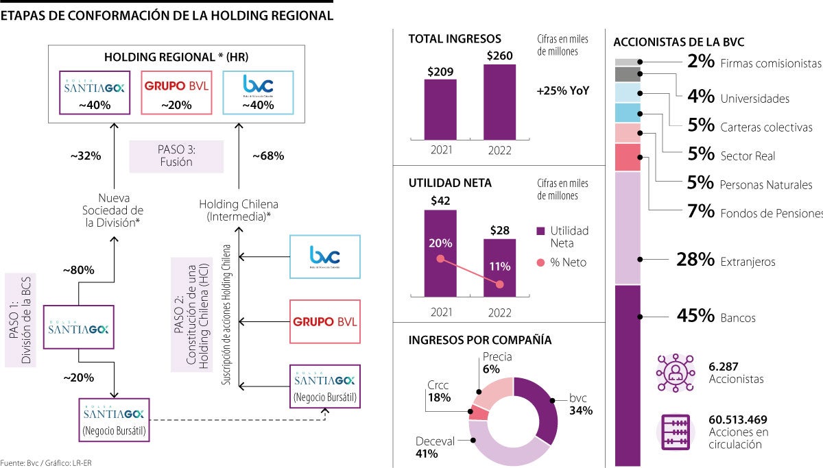 La idea es que cada acción de la bvc se intercambie por el mismo número de acciones de la holding regional. Para esto, se anunciará en las próximas semanas de qué manera se va a realizar ese intercambio a los actuales dueños de los títulos, especialmente a los pequeños accionistas. Vale resaltar que la transferencia de las acciones no se ha realizado, sino que hasta el momento solo se recibió el aval de la Superfinanciera para hacerlo.