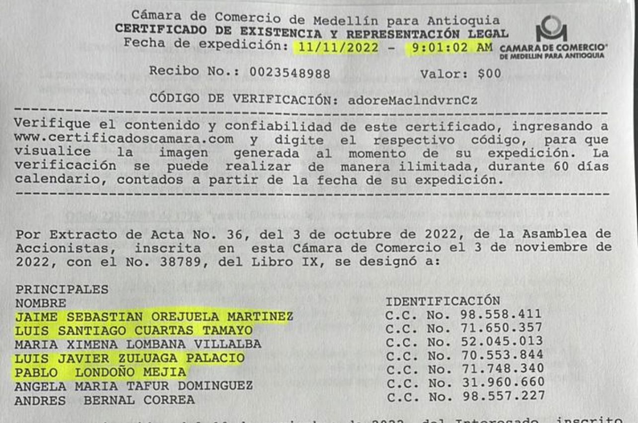 A pesar de esto, hasta hoy, 15 de noviembre, siguen apareciendo en la Cámara de Comercio como integrantes de la Junta los siete miembros, lo que le suma argumentos a quiénes dicen que el acta de ese día, y en la cuál se toma la decisión de la venta, sí es válida.