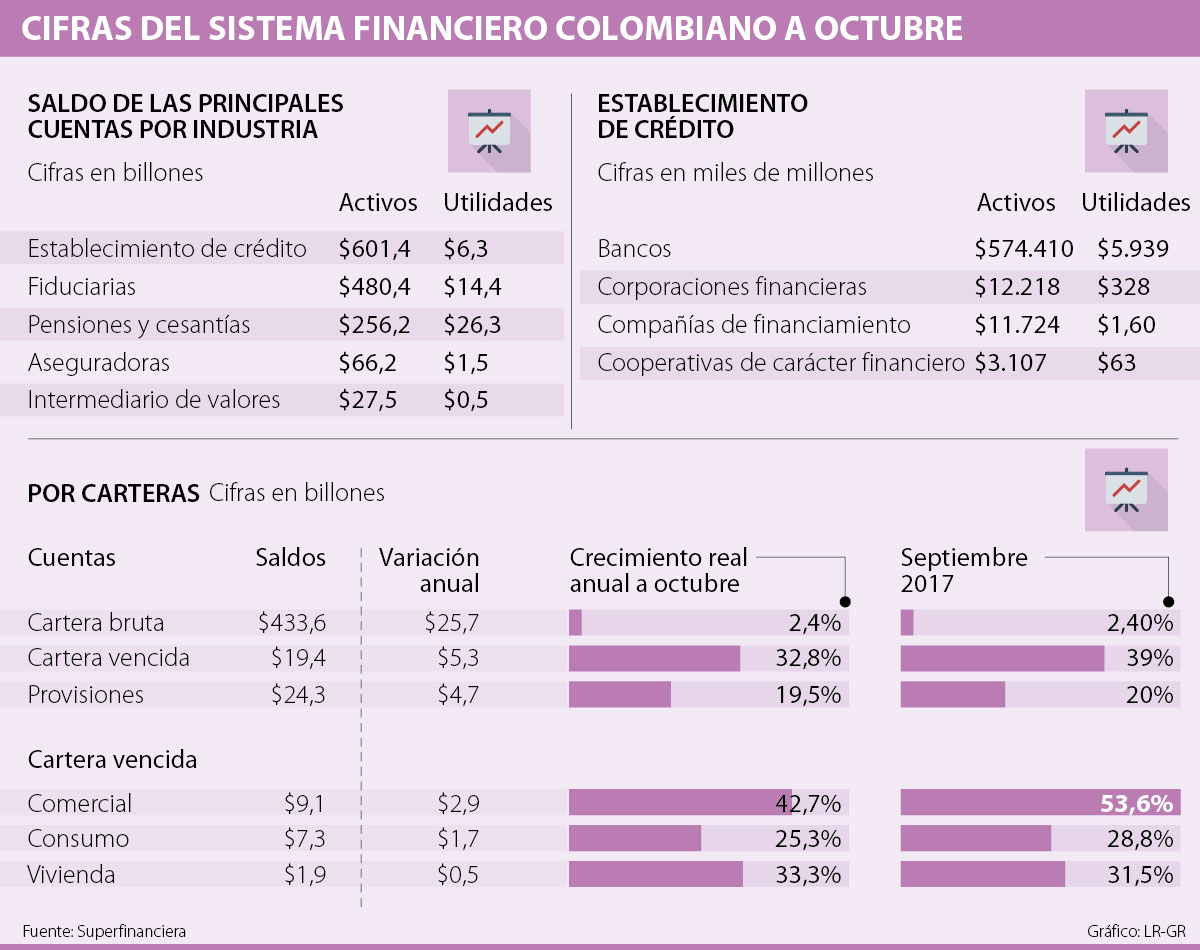 En su informe, la Superfinanciera destacó que, en general, la tasa de crecimiento real anual de la cartera vencida se desaceleró en octubre, pues presentó una disminución de 6,16 puntos porcentuales respecto al mes anterior; sin embargo, Daniel Escobar, director de estrategia de Global Securities, mencionó que es posible que siga aumentando la mora, por como vienen presentándose las tendencias de deterioro del crédito y las cifras de desempleo.