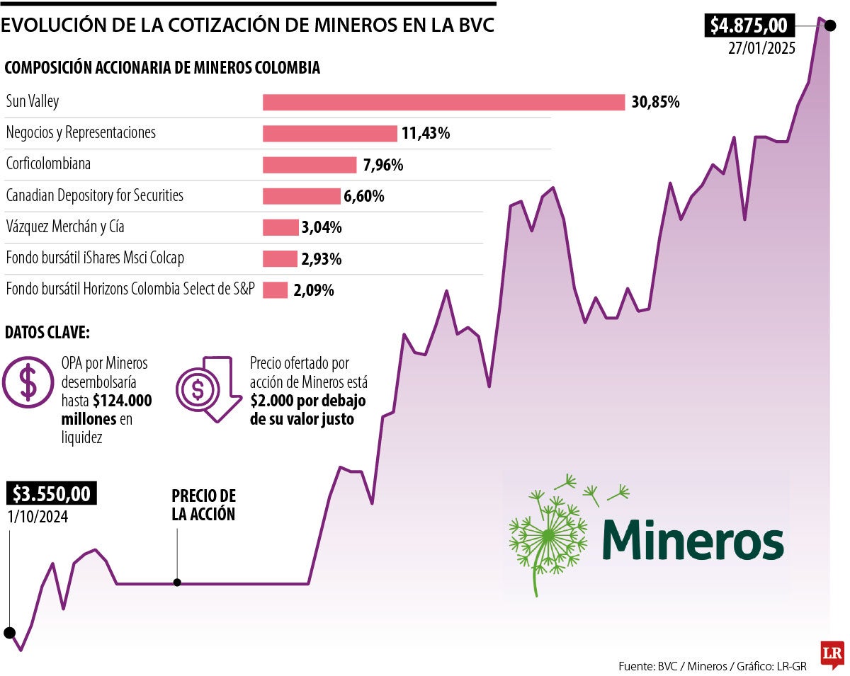 En un análisis detallado elaborado por el equipo de renta variable de Visión Davivienda, la transacción de Mineros implicaría una inyección entre $68.939 millones y $124.092 millones, partiendo de un precio de $4.600 por acción y la adquisición de una participación entre 5% y 9% de la compañía.