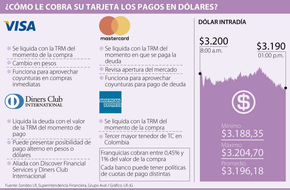 Las novedades llevaron a la divisa a cerrar en $3.190, lo que indicaría que la TRM no será tan alta y que, de mantenerse la tendencia, estaremos viendo un dólar más bajo en el mercado local. Esto presenta una oportunidad para hacer pagos en dólares con tarjeta de crédito, teniendo en cuenta las formas de pago y que los cobros de las franquicias están entre 0,45% y 1%.