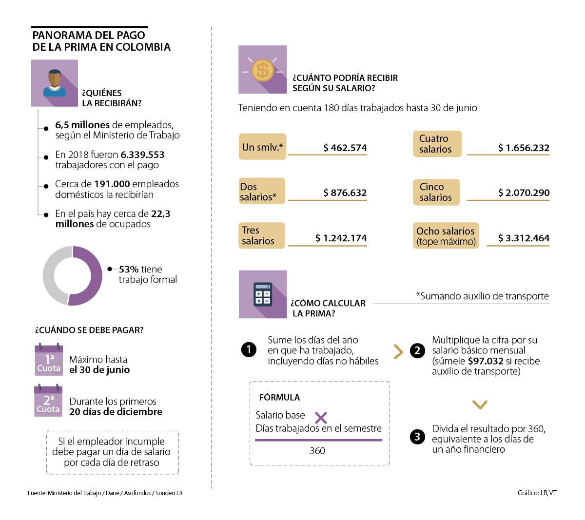 En este año, el Ministerio de Trabajo espera que sean 6,5 millones de empleados los que reciban el pago extra, frente a los 6,34 millones de colaboradores que la recibieron durante 2018, de acuerdo con la Gran Encuesta Integrada de Hogares realizada por el Dane; un aumento de cerca de 160.000 asalariados.