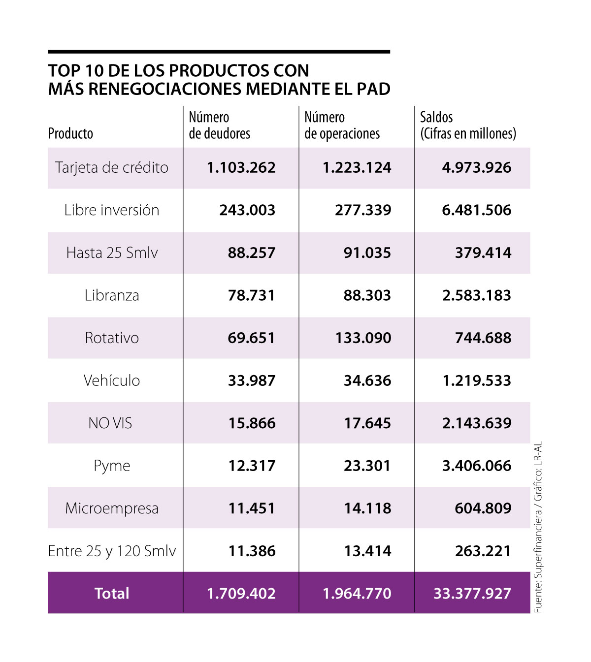 Cerrando el top cinco de los productos con más renegociaciones están los créditos de libranza, con 78.731 deudores; y los rotativos, con 69.651. Mientras que los productos que registraron menos solicitudes fueron los créditos del segmento financiero/institucional y los del oficial/gobierno, pues solo se han acogido al PAD cuatro y 12 deudores, respectivamente.