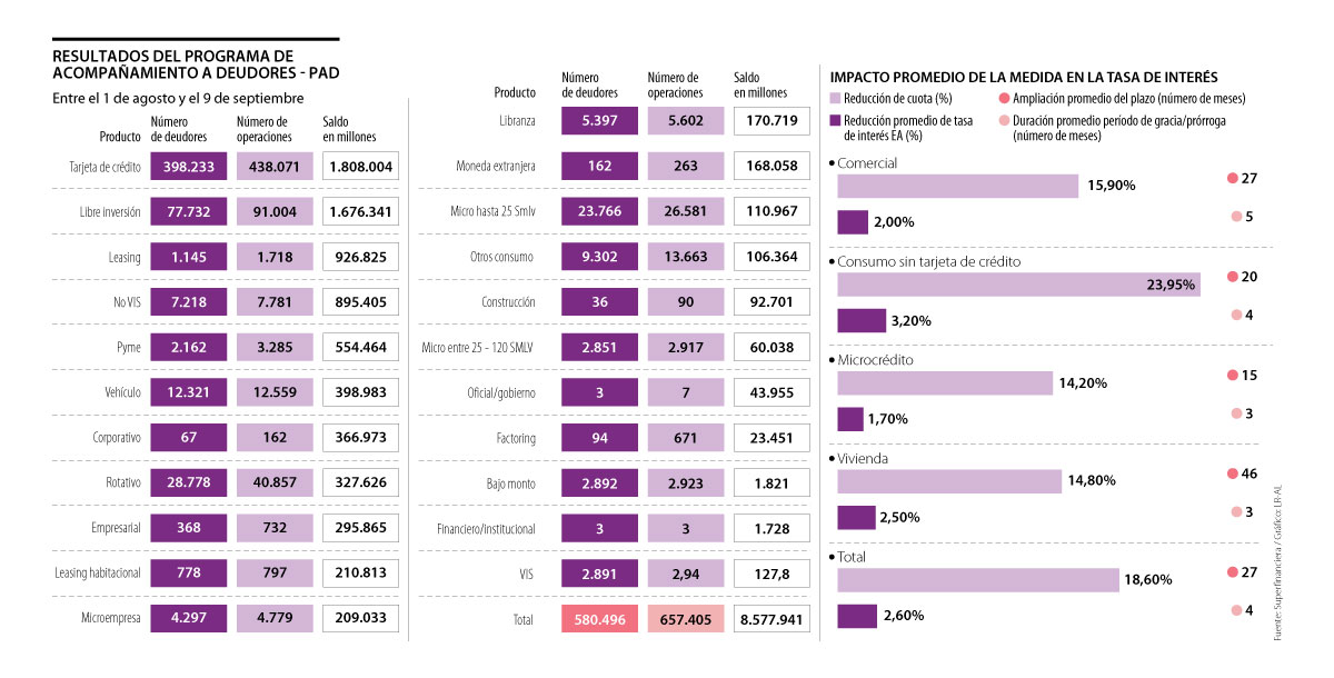 Mediante el Programa de Acompañamiento a Deudores (PAD), el cual fue impartido por la Superintendencia Financiera de Colombia que entró en vigencia desde el 1 de agosto, 580.496 deudores redefinieron sus créditos por un valor de $8,5 billones al 9 de septiembre.