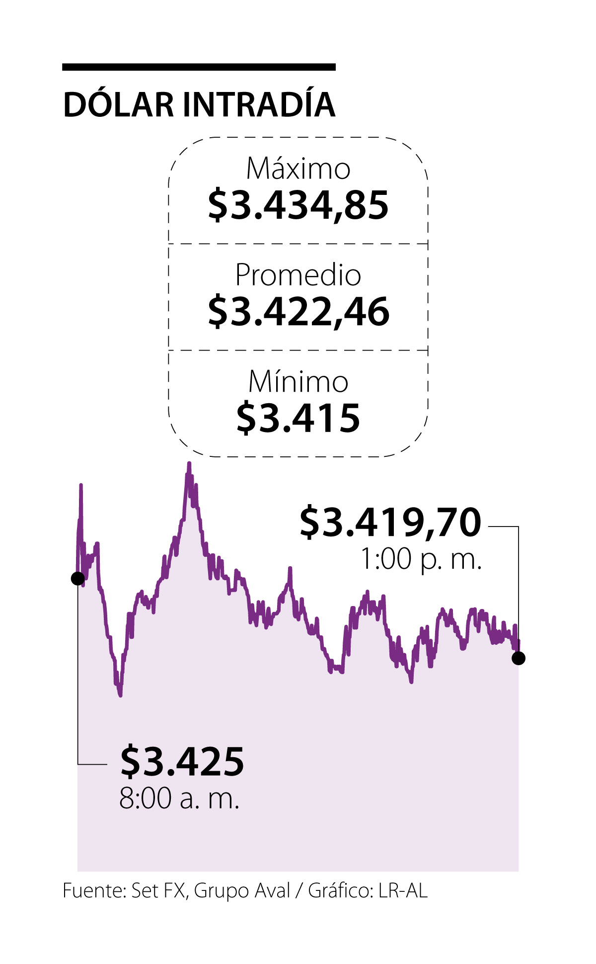 El martes, el dólar alcanzó un precio promedio de $3.422,46, lo que representó una caída de $4,51 frente a la tasa representativa del mercado (TRM), que se ubicó ese día en $3.426,97.