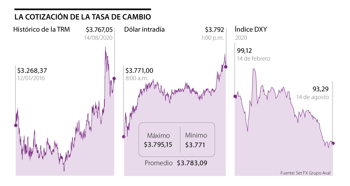 El viernes, el dólar alcanzó un precio promedio de $3.783,09, lo que representó un alza de $16,04 frente a la tasa representativa del mercado (TRM), que ayer se ubicó en $3.767,05. El precio promedio del día regresó a niveles que no se veían desde mayo.
