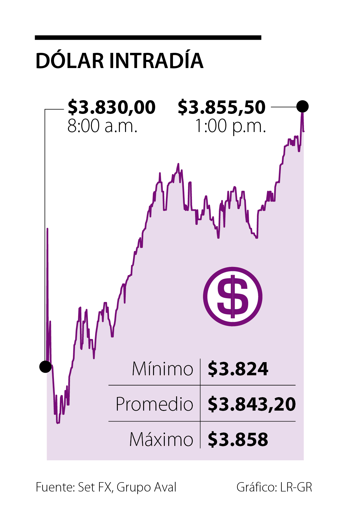 La apertura de la moneda fue de $3.845 y su cierre fue de $3.855,50. El precio mínimo que se registró en la plataforma Set-Fx fue de $3.824, mientras que el máximo fue $3.858. El monto negociado durante la jornada fue de US$529,07 millones en 734 transacciones.