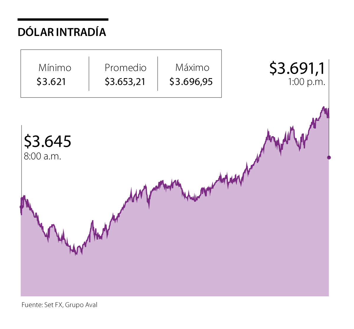 La divisa abrió la jornada con un precio de $3.645 y su cierre fue de $3.691,10. El precio mínimo que se registró en la plataforma Set-Fx fue de $3.621, mientras que el máximo fue $3.696,95. El monto negociado durante la jornada fue de US$1.173,35 millones en 2.152 transacciones.