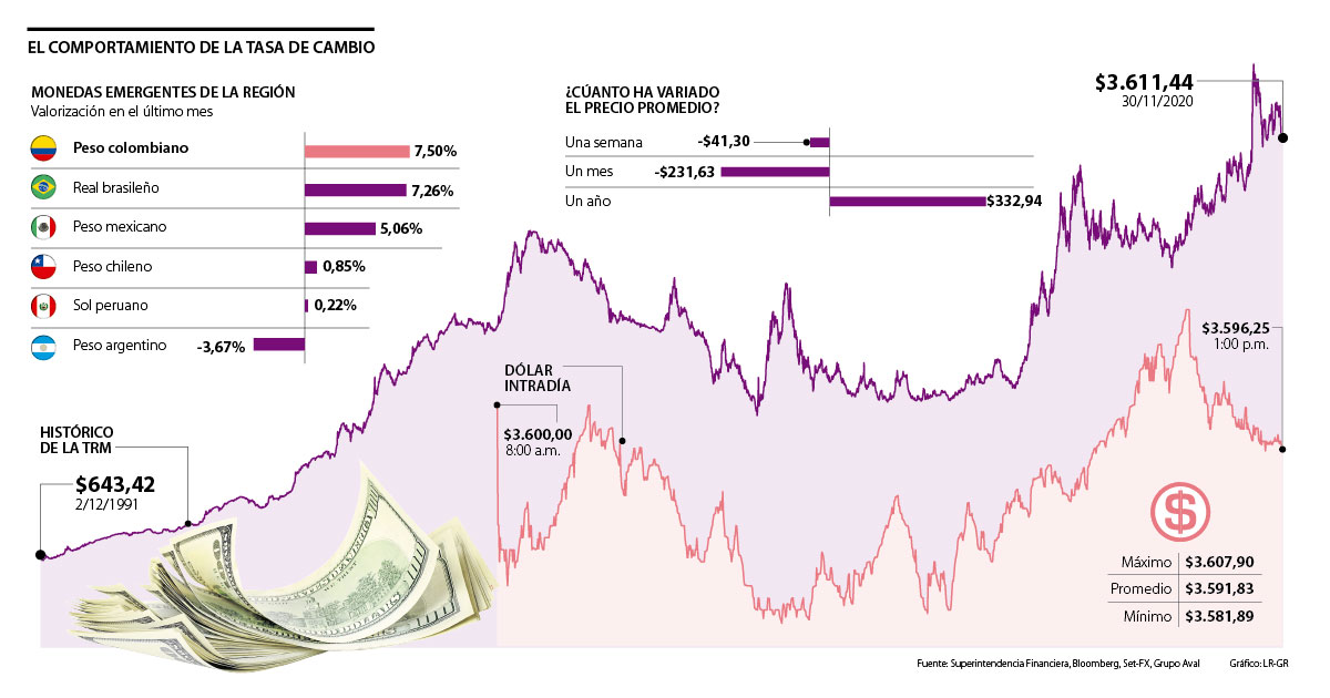 El lunes, último día del mes de noviembre, el dólar alcanzó un precio promedio de $3.591,83, lo que representó una caída de $19,61 frente a la tasa representativa del mercado (TRM), que se ubicó en $3.611,44. El precio promedio de la tasa de cambio no se ubicaba en niveles de $3.590 desde la primera semana de junio.